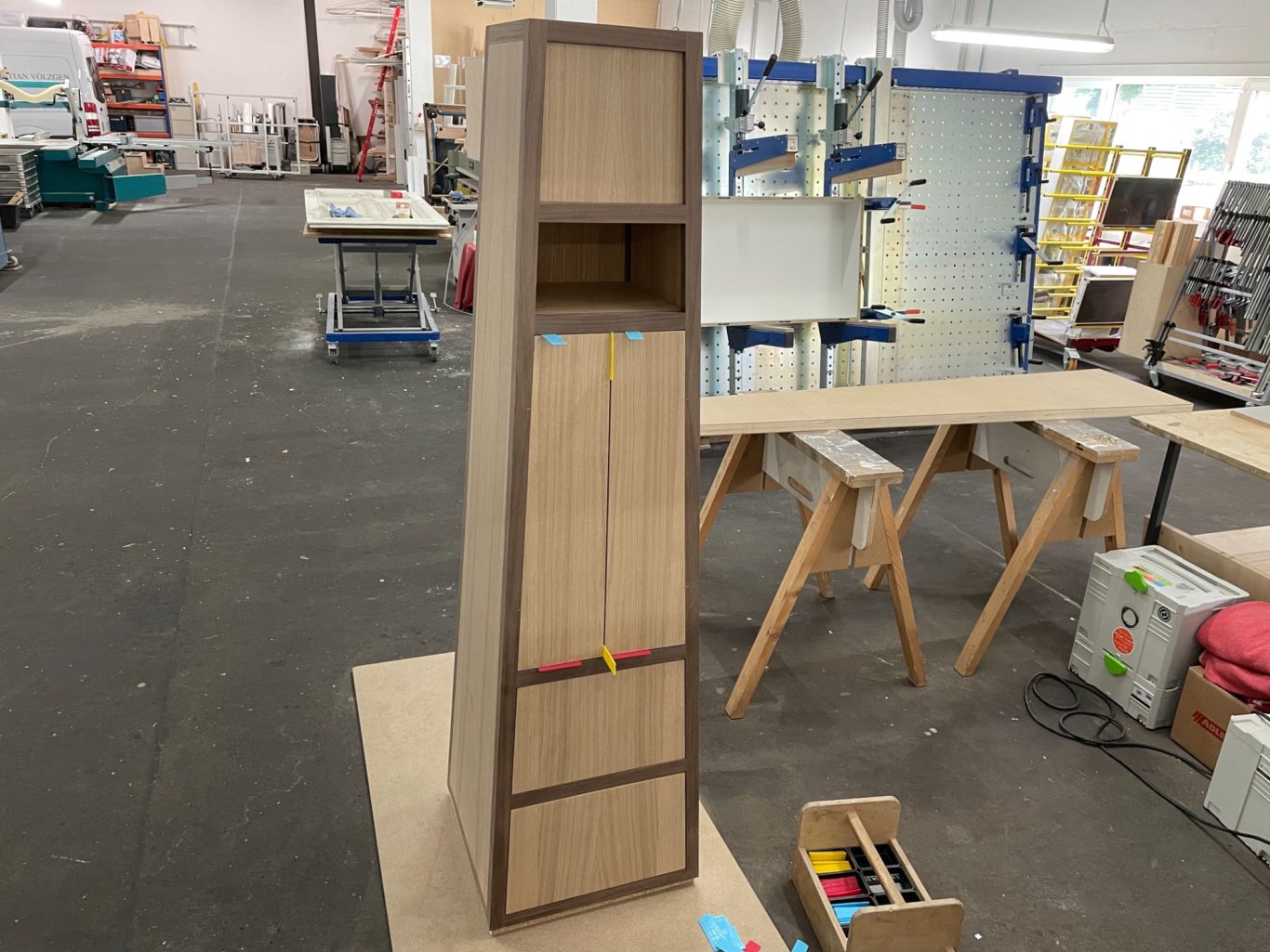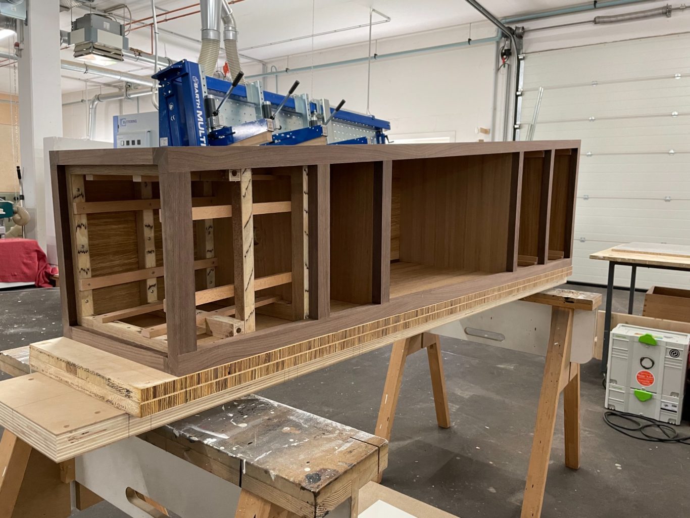 Das Ergebnis lag schließlich in horizontal furnierter Kernbuche mit Nussbaum-Anleimer vor. Fazit: Die Form wirkt gleichmäßig und nicht zu voluminös, doch bezüglich Gestaltung und Einteilung stehen noch viele Fragen offen.