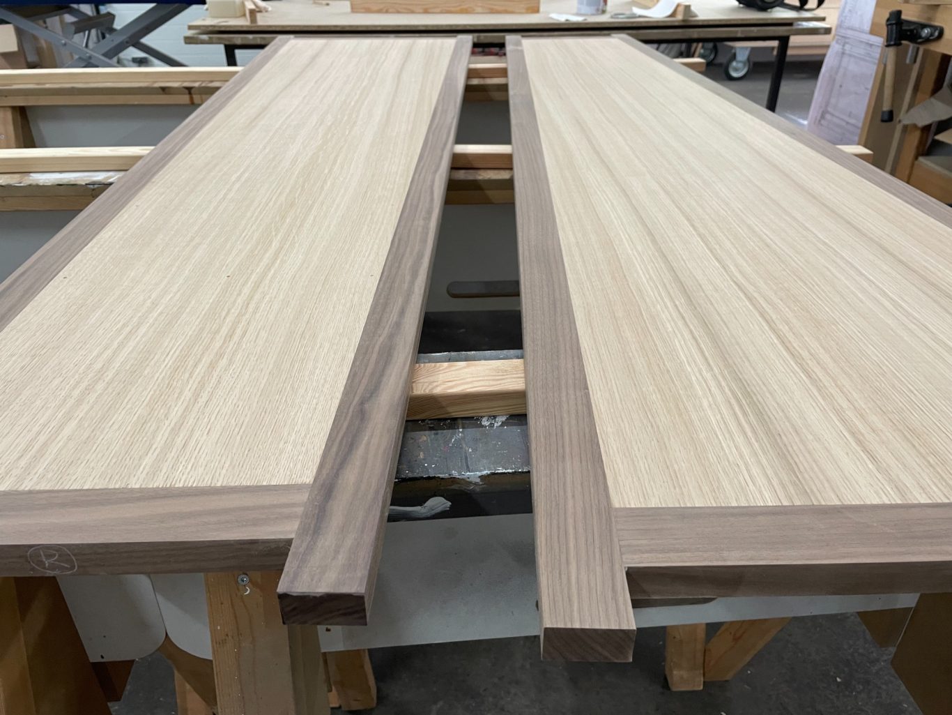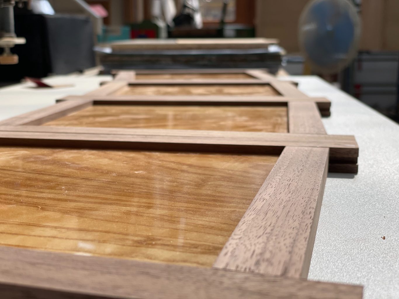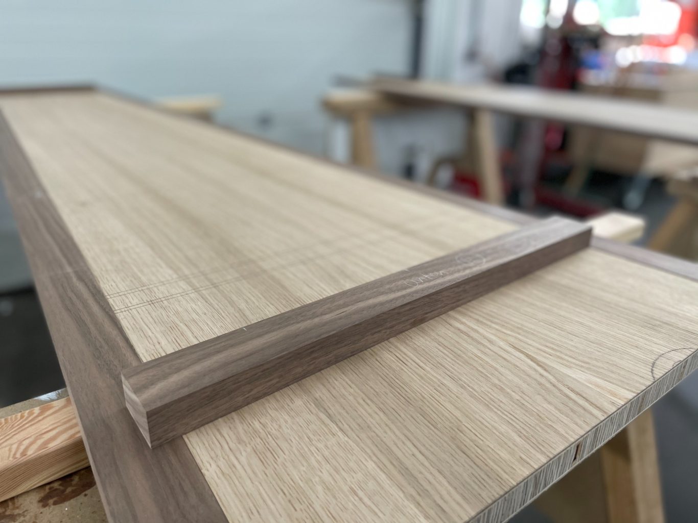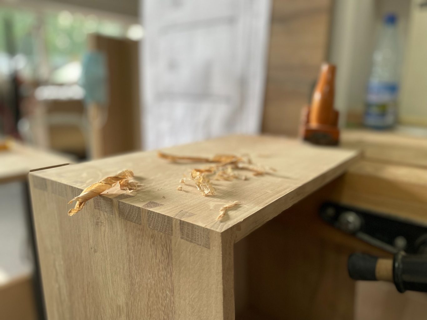 Die Planung wurde deshalb wieder zurück an das Zeichenbrett verschoben, um zwei große Bereiche abzudecken: Die trichtergezinkten Schubkästen und die konisch zulaufenden Türen mit passender Anschlagslösung.