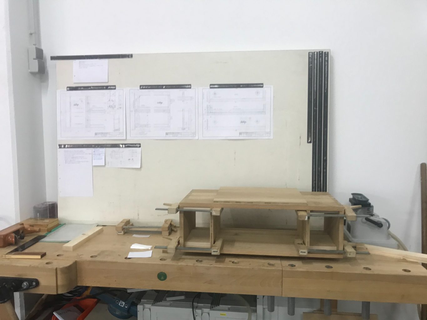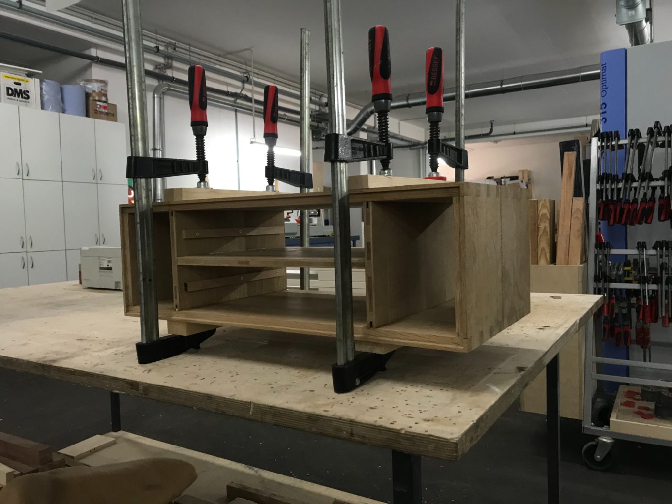 In den Februar hinein konkretisierten sich vor allem die Proportionen. In der Werkstatt wurden Transportspanplatten zugeschnitten und zusammen geschraubt, um vor allem die Maße des Korpus festzulegen, welche im Nachhinein auf allen anderen Ebenen übernommen wurden.