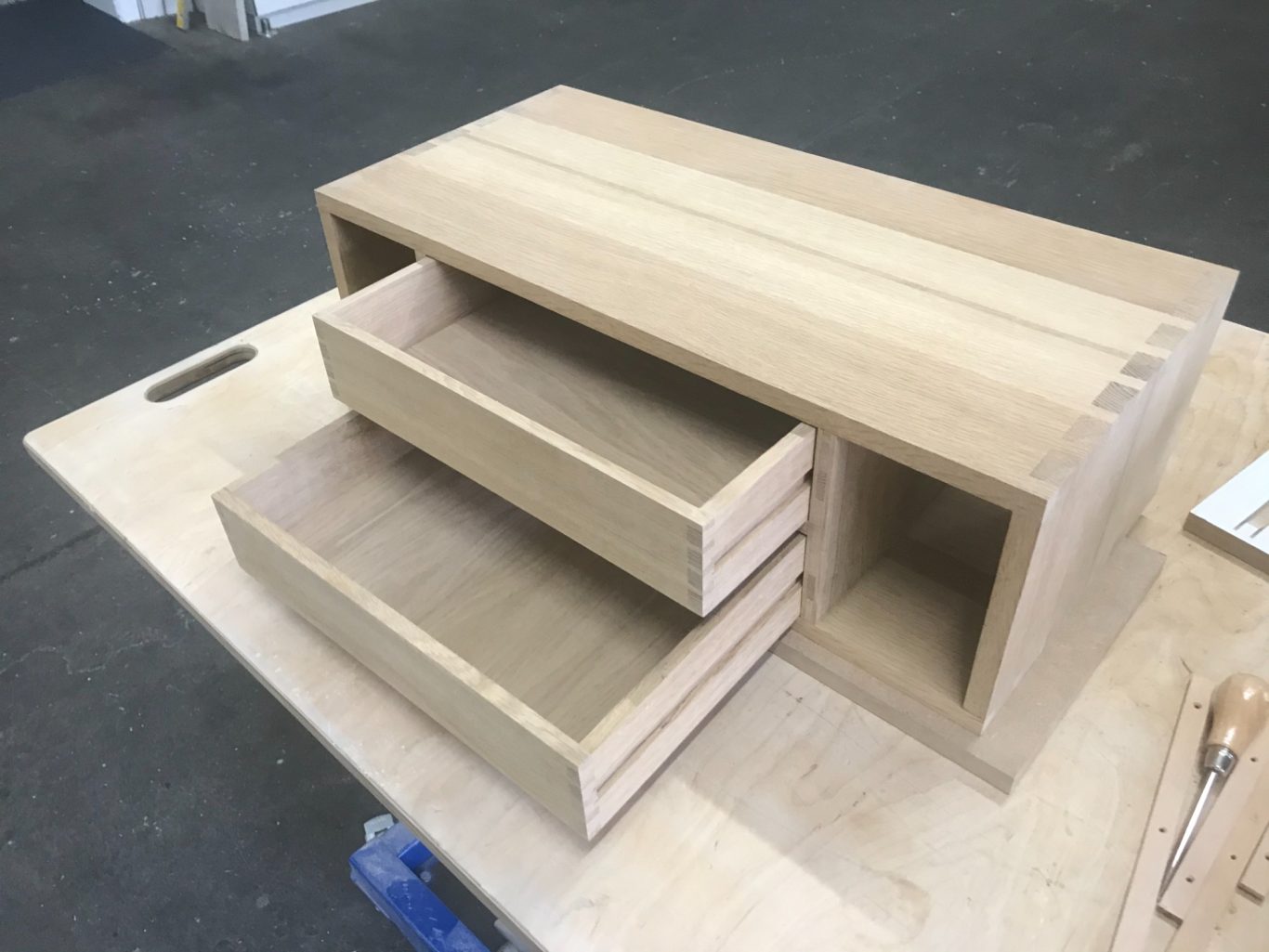 Das Nuten der Führungen, das Verputzen des Kastens, aber allem voran das Einpassen der Schubkästen in die Führungsleisten nahm zum Ende hin sehr viel Zeit in Anspruch, weil all diese Arbeiten zum ersten Mal durchgeführt wurden.