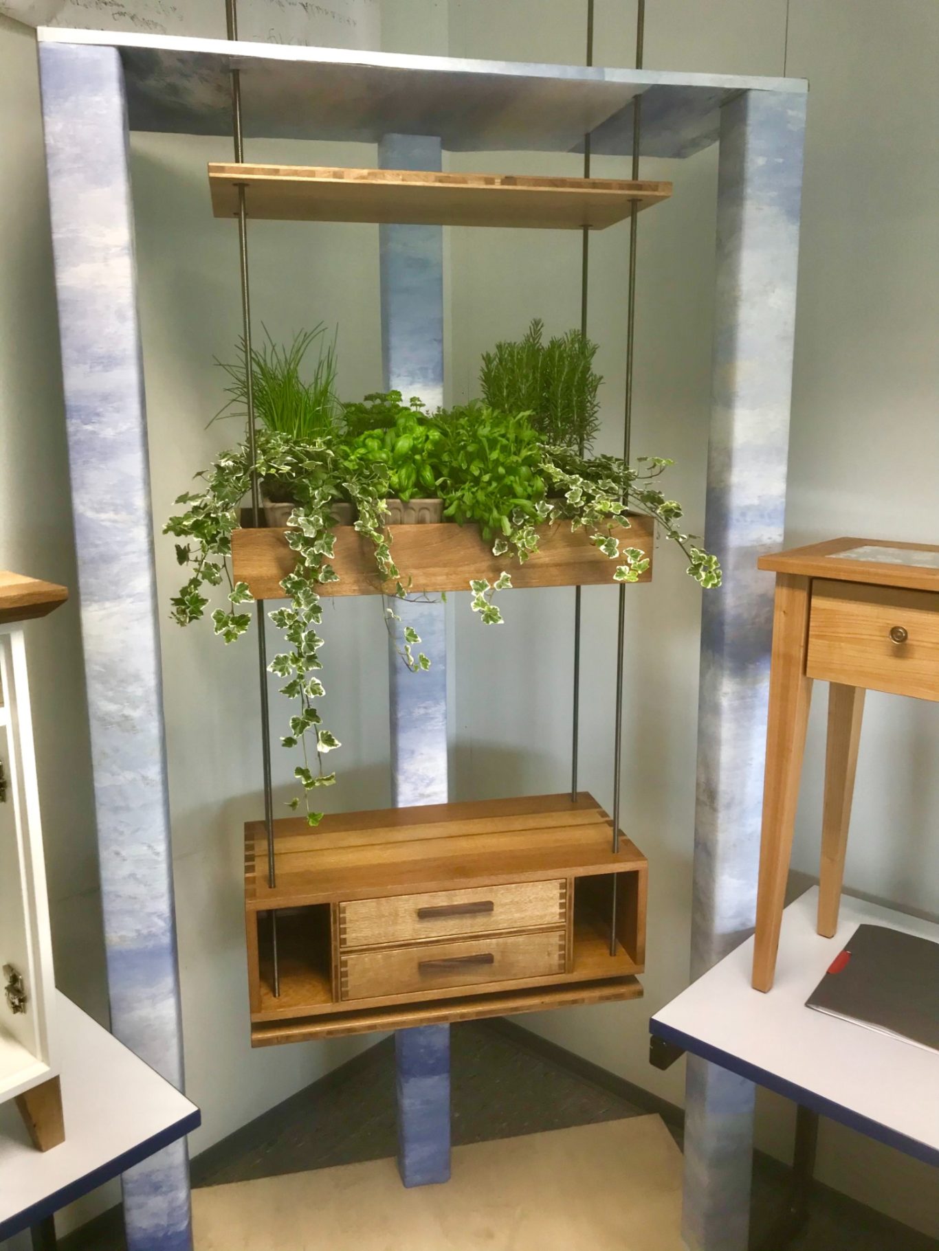 Gerade deshalb sind die meisten Eckverbindungen traditionell gezinkt, das Stück kann nach Belieben individuell verändert werden (Bepflanzung und Positionierung der vier Teile) und anders als viele andere Möbelstücke hängt es, „wie im Himmel“, von der Decke herab.